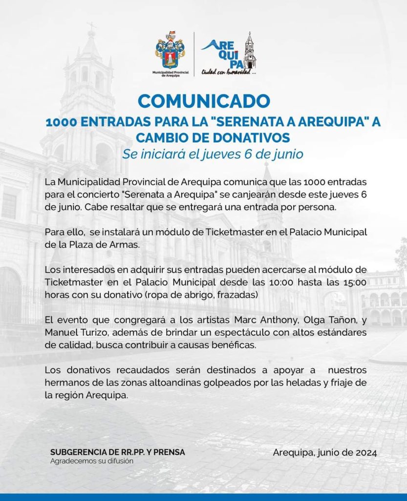 En un reciente comunicado, la Municipalidad Provincial de Arequipa (MPA), organizadora del evento, anunció que canjearán mil entradas por frazadas y ropa de abrigo para los damnificados por las heladas y el friaje en las zonas altoandinas de la región.