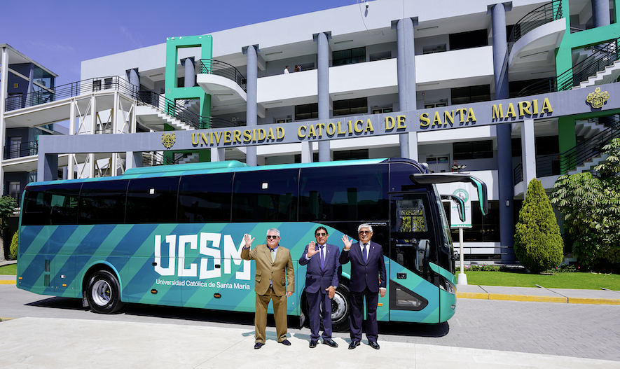 La Universidad Católica de Santa María (UCSM) marcó un hito en la educación superior del país al convertirse en la primera universidad del Perú en impulsar la movilidad eléctrica y sostenible, con la puesta en marcha de dos buses 100% eléctricos destinados al transporte gratuito de su comunidad universitaria.