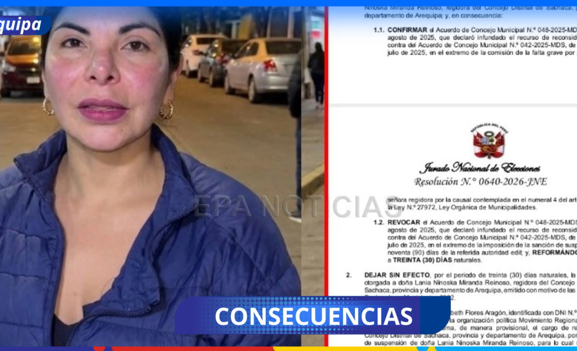 El Jurado Nacional de Elecciones ratificó la sanción contra la regidora de Sachaca, Lania Miranda Reynoso, por conducir en estado de ebriedad en mayo de 2025. El organismo confirmó que se trató de una falta grave, aunque redujo la suspensión de 90 a 30 días aplicando el criterio de proporcionalidad. Señaló que este tipo de conducta pone en riesgo la seguridad pública y afecta la imagen institucional, por lo que resulta incompatible con el ejercicio del cargo público.